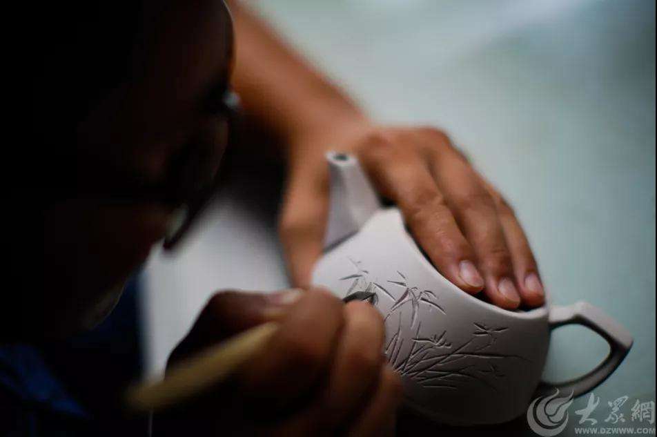 谷善龍正在對(duì)茶壺進(jìn)行雕刻