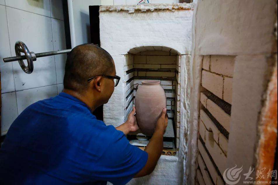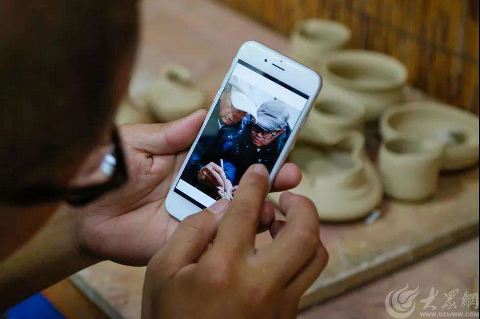 濟(jì)南市陶瓷藝術(shù)大師谷善龍正在欣賞自己的作品圓融壺