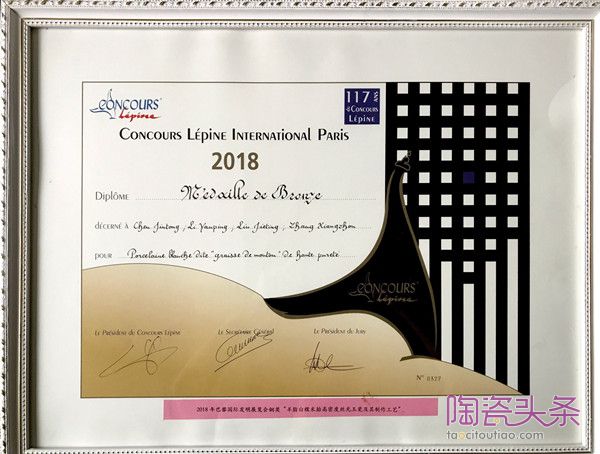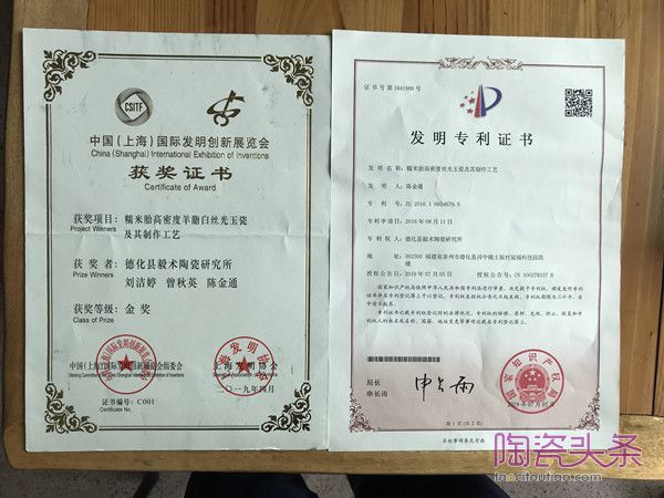“羊脂白糯米胎高密度絲光玉瓷”在2018年榮獲法國(guó)巴黎國(guó)際發(fā)明展覽會(huì)銅獎(jiǎng),在2019年4月中國(guó)(上海)國(guó)際發(fā)明創(chuàng)新展覽會(huì)上榮獲金獎(jiǎng)。
