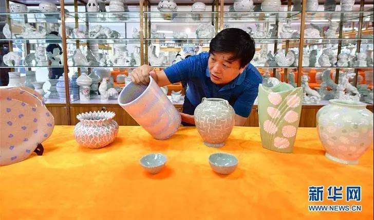 在河南省焦作市修武縣當(dāng)陽峪村,“當(dāng)陽峪絞胎瓷燒制技藝”國家級代表性傳承人柴戰(zhàn)柱采用絞胎技法,將不同花色的泥塊重組在一起。