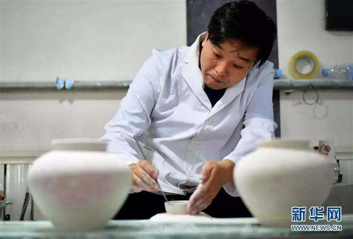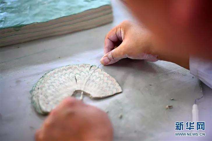 在河南省焦作市修武縣當(dāng)陽峪村,“當(dāng)陽峪絞胎瓷燒制技藝”國家級代表性傳承人柴戰(zhàn)柱在“編織”絞胎瓷的羽毛紋圖案。