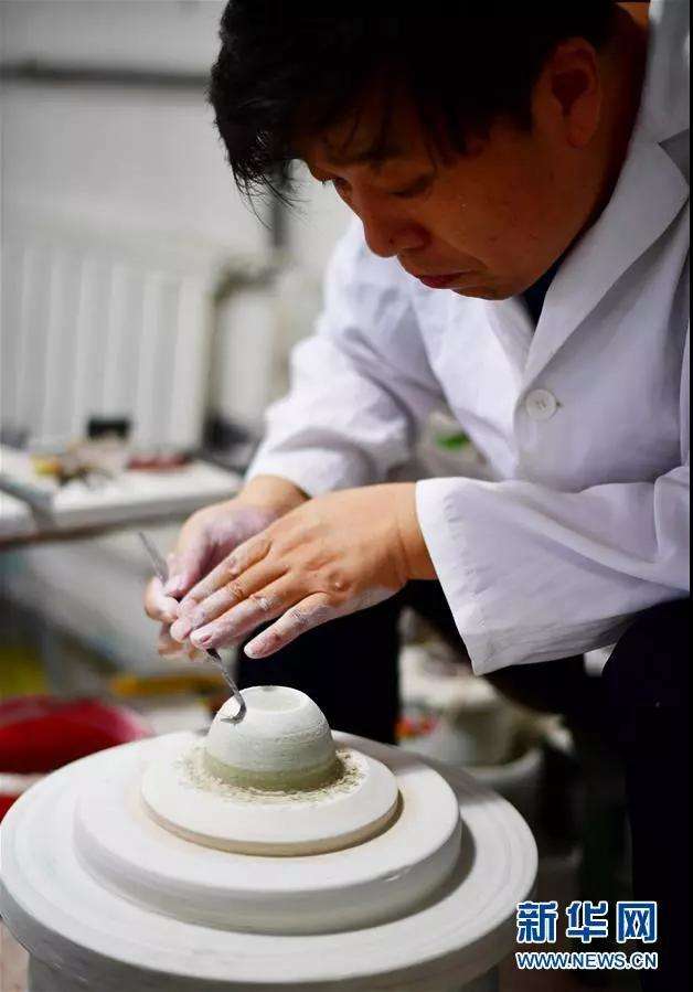 在河南省焦作市修武縣當(dāng)陽峪村,“當(dāng)陽峪絞胎瓷燒制技藝”國家級代表性傳承人柴戰(zhàn)柱在修坯。