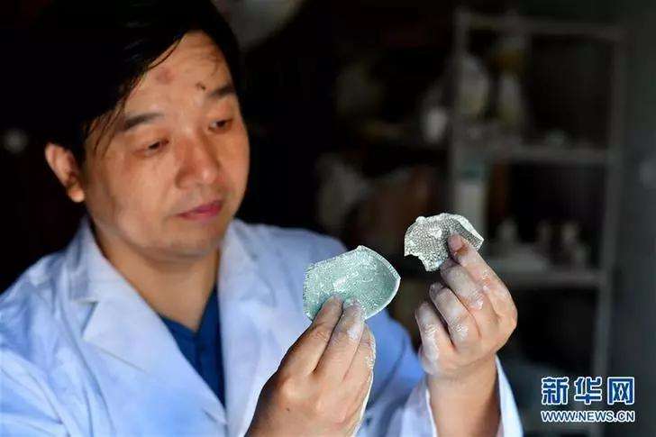 在河南省焦作市修武縣當(dāng)陽峪村,“當(dāng)陽峪絞胎瓷燒制技藝”國家級代表性傳承人柴戰(zhàn)柱在查看絞胎瓷瓷片的紋路。