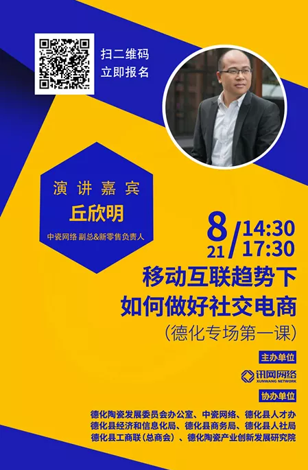 由此,由訊網(wǎng)網(wǎng)絡(luò)主辦,德化縣陶瓷發(fā)展委員會辦公室、德化縣商務(wù)局等單位協(xié)辦的主題為“移動互聯(lián)網(wǎng)趨勢下·如何做好社交電商” 的分享沙龍,將于8月28日在陶瓷街原行政服務(wù)中心三樓(德化縣陶瓷發(fā)展委員會辦公室)舉行,沙龍?zhí)貏e邀請中瓷網(wǎng)絡(luò)副總&新零售負責(zé)人丘欣明作主題分享。