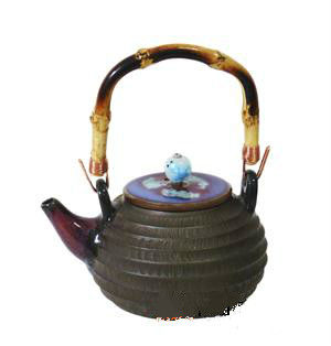 “去年7月,哈爾濱的藏家李先生來到我這里買鈞瓷壺。閑聊起鈞瓷壺的創(chuàng)新時,他建議我多看看日本鐵壺。因?yàn)槔钕壬怯忻娜毡捐F壺藏家,在鐵壺 研究方面有很深的造詣。不久,宜興陶協(xié)秘書長盧劍星、西安美院博士楊志來我這里交流制壺技藝,其間談到紫砂壺工藝與鈞瓷工藝的互補(bǔ)、鈞瓷壺裝飾的創(chuàng)新,對 我啟發(fā)很大。于是,我開始琢磨鈞瓷壺的創(chuàng)新?!崩罱ㄤh說,“鈞瓷始于唐,古唐鈞又稱黑唐鈞,黑唐鈞極具金屬質(zhì)感。于是,我用黑唐鈞的執(zhí)壺作藍(lán)本,壺體采用 特殊工藝處理,壺把、壺嘴、壺蓋施鈞釉,開始了創(chuàng)新試驗(yàn)。”