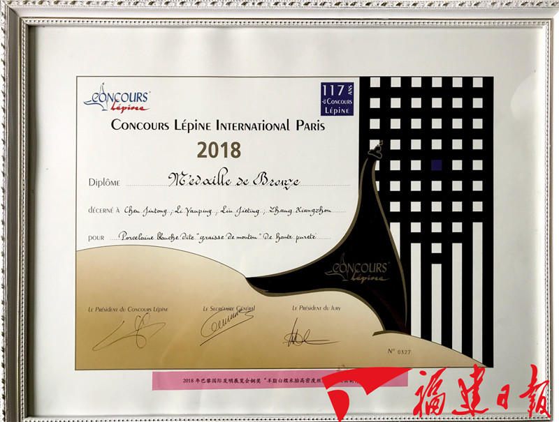 日前,德化縣毅術(shù)陶瓷研究所藝術(shù)總監(jiān)、福建省工藝美術(shù)大師陳金通收到來自法國(guó)巴黎的一張獲獎(jiǎng)證書,他潛心研發(fā)的“羊脂白糯米胎高密度絲光玉瓷及其制作工藝”榮獲法國(guó)巴黎第117屆國(guó)際發(fā)明展覽會(huì)銅獎(jiǎng)。