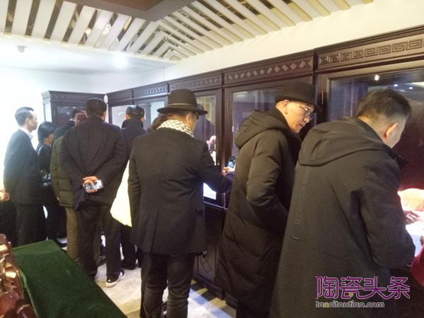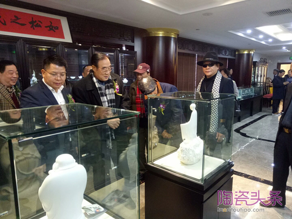 領(lǐng)導(dǎo)與嘉賓在參觀本次展覽的陶瓷與青田石雕作品