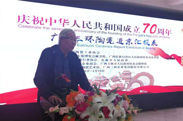 為慶祝中華人民共和國成立70周年,廣西三環(huán)陶瓷進(jìn)京匯報(bào)展于2019年3月8日在北京國中陶瓷藝術(shù)館開幕。中國輕工業(yè)聯(lián)合會(huì)、中國陶瓷工業(yè)協(xié)會(huì)、中國輕工工藝品進(jìn)出口商會(huì)、中國東盟博覽會(huì)秘書處、北京廣西商會(huì)有關(guān)領(lǐng)導(dǎo), 玉林市副市長劉勝友、北流市市長李崗、副市長高巍、三環(huán)集團(tuán)董事長陳誠等出席開幕式。