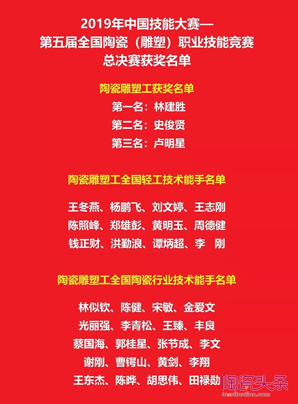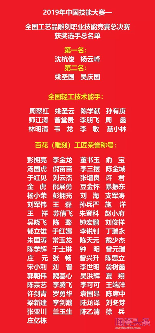 2019年中國技能大賽——第五屆全國陶瓷(雕塑)職業(yè)技能競賽總決賽德化獲獎名單: