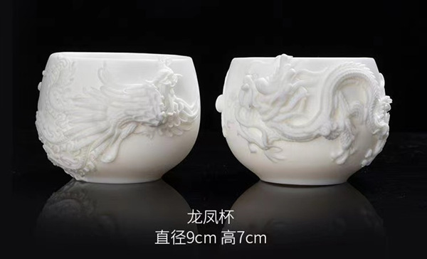 林麗品展示架上的杯子很引人注目。這是她的新作品——“龍鳳對杯”“鳳凰合鳴”“雙龍戲珠”三個組合,寓意分別為情侶杯、姊妹杯和兄弟杯(或父子杯),可按需自選組合,表情達意。為做好這個杯子,林麗品準備了三年時間:一要考慮杯形與瓷線雕的結合,避開繁復,留有余地;二要考慮手感,手握一杯,可喝水、喝茶,亦可品酒對飲。只有杯子手感好,人們才不會輕易把杯子放下,而且,可以輕撫杯上浮雕,在細聊慢品中享受閑暇時光。