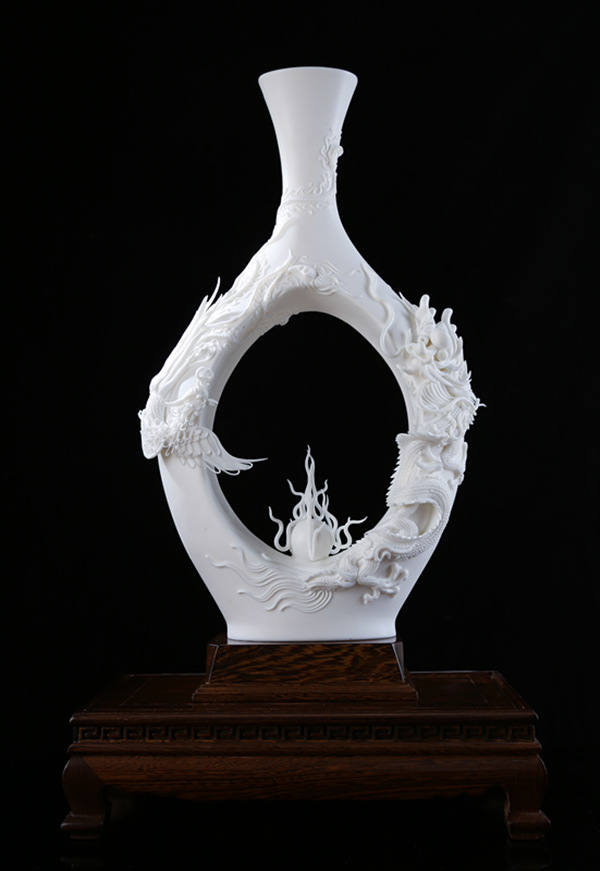走進林麗品的工作室,各種瓷線雕作品在燈光映襯之下,祥云繚繞,龍鳳翩躚,引人遐想萬千。天道酬勤,歷經多年的探索,林麗品獨創(chuàng)瓷線雕技法,在德化琳瑯滿目的白瓷品類中,獨出機杼,煥發(fā)新彩。