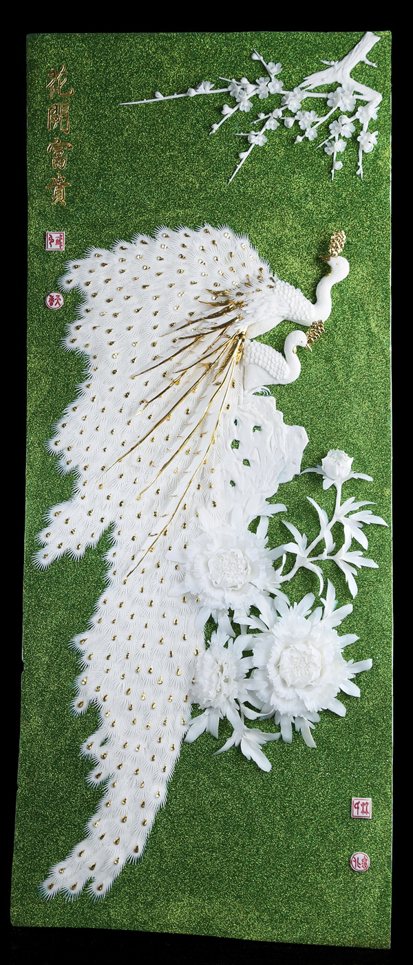 從她的瓷板畫新作《吉祥》中,你會看到,單是那只孔雀身上的幾百根白色羽毛,全都是手工制作,然后用手逐一嵌到板上,創(chuàng)作極其繁瑣,創(chuàng)作時間長達一年,但她毫不在意,只要作品足夠好,她就覺得值。