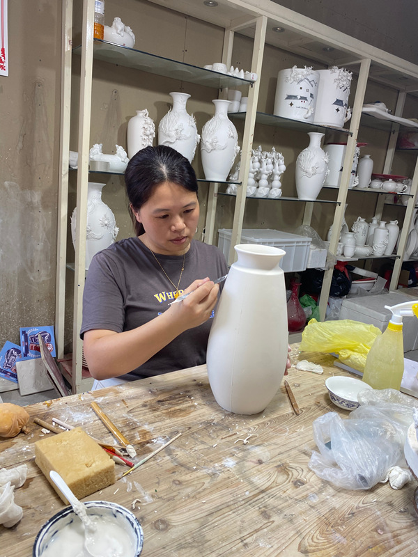 漸漸地,一個新穎、大膽的想法從她腦袋里冒了出來:她想改“漆線”為“瓷線”,創(chuàng)造出一種新的陶瓷裝飾呈現(xiàn)形式——“瓷線雕”。她認為,漆線雕是閩南地區(qū)的傳統(tǒng)工藝,也是中國漆藝文化寶庫中的藝術瑰寶之一,而“好瓷何須釉為裳”,德化白瓷本質溫潤如玉,不一定需要紅釉、藍釉等色彩的加持,本身就天生麗質、經典優(yōu)雅,瓷線雕則可以將德化白瓷的材質美和捏塑的工藝美相結合,二者相得益彰。