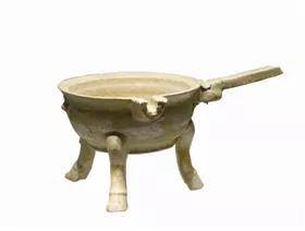 青釉鐎斗(圖2):鐎斗,是一種底有三足、旁有持柄的器皿,流行于兩漢魏晉,至唐宋逐漸消失。關(guān)于其起源和用途,一直有很多說法。有人認(rèn)為它是溫酒器,有人認(rèn)為它是煮茶的用具,也有人認(rèn)為是敲擊警眾的器皿,《木蘭辭》“朔氣傳金柝,寒光照鐵衣”中的“金柝”,就是“鐎斗”——對(duì)照上述種種用途,趙郡李氏家族墓出土的這件鐎斗,顯然應(yīng)當(dāng)歸于專門用以隨葬“冥器”之列。此件青釉鐎斗,器身為圓口深腹,形如小盆,一側(cè)設(shè)有長(zhǎng)柄,蹄足外撇,內(nèi)外施青釉,素面無紋。