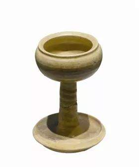 青釉燈(圖3):北朝青釉瓷器大多數(shù)光素?zé)o紋,有的有簡(jiǎn)單的弦紋,趙郡李氏家族墓出土的這件青釉燈,就是如此。整器由燈臺(tái)、燈柱和底座三部分組成。燈臺(tái)呈碗形,中心立有一圓形管狀燈柱。燈柱中空,外表裝飾有一圈圈凸棱的弦紋。底盤為敞口、平底。燈外施青釉,釉面開片。造型新穎美觀,小巧玲瓏。