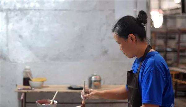 記者跟隨工作人員一同來到生產(chǎn)車間內(nèi),車間內(nèi)機器聲并不刺耳,有些展區(qū)需要隔著玻璃或是警戒線,同時也有些展區(qū)甚至允許游客走到工人身邊,近距離觀看制作瓷器的細節(jié)。在其中的一個步驟展區(qū)內(nèi),記者看到一位工人將灰色的陶碗浸入一個盛有青色顏料的大水缸內(nèi),由于工人是用右手拿著陶碗,她的右手上滿是青色的顏料。隨后每四只青色的瓷碗放置到一塊木板上,再由另一位工人一次運走。據(jù)園內(nèi)解說員介紹,這是在給陶碗掛釉,只有掛上釉的陶碗燒制出來才是瓷碗。