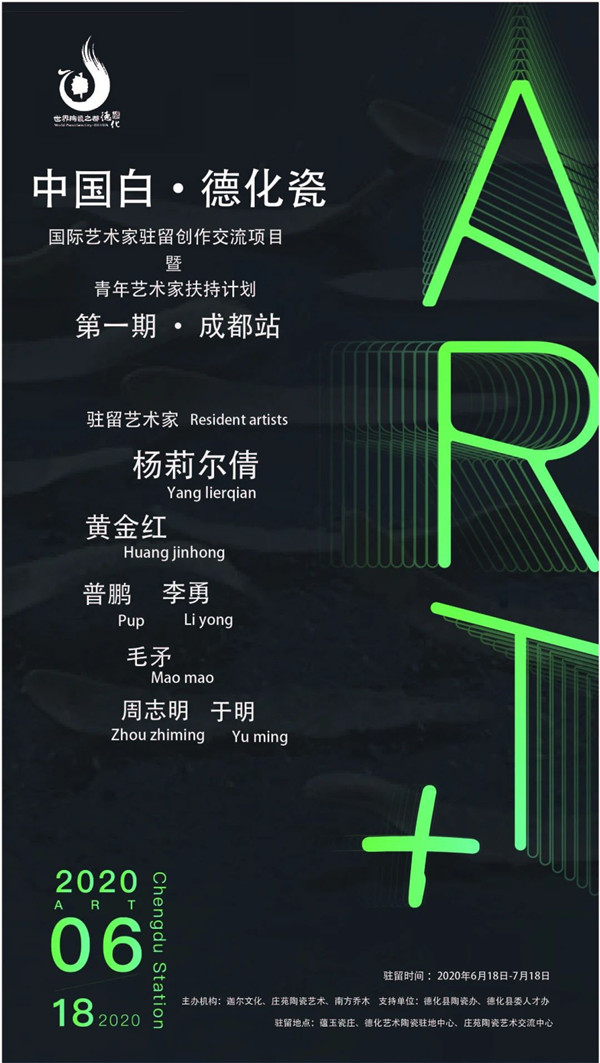 由迦爾文化、莊苑陶瓷藝術(shù)交流中心、蘊(yùn)玉瓷莊、南方喬木主辦的“·德化瓷ART+國(guó)際藝術(shù)家駐留創(chuàng)作交流項(xiàng)目暨青年藝術(shù)家扶持計(jì)劃第1期”于2020年6月18日正式開啟,來自成都區(qū)域的6位藝術(shù)家:楊莉爾倩、黃金紅、普鵬、李勇、毛矛、周志明參與了此期的駐留。