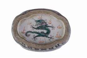 這件扁瓶的橫截面并非圓形,這種造型一般可稱為“海棠式”,所以該扁瓶既是大件器物又是異型器物,其制造的難度顯然更大。另外,一般的瓷器底部多繪有、刻有“年號(hào)款”或“堂名款”,亦或繪一朵小花等簡(jiǎn)單圖案,稱為“花押款”,而像這件扁瓶底部繪有這么大的綠彩云龍紋,是非常奇特而少見的。這說明民國(guó)時(shí)期瓷器的裝飾不拘一格,敢于創(chuàng)新,別開生面。