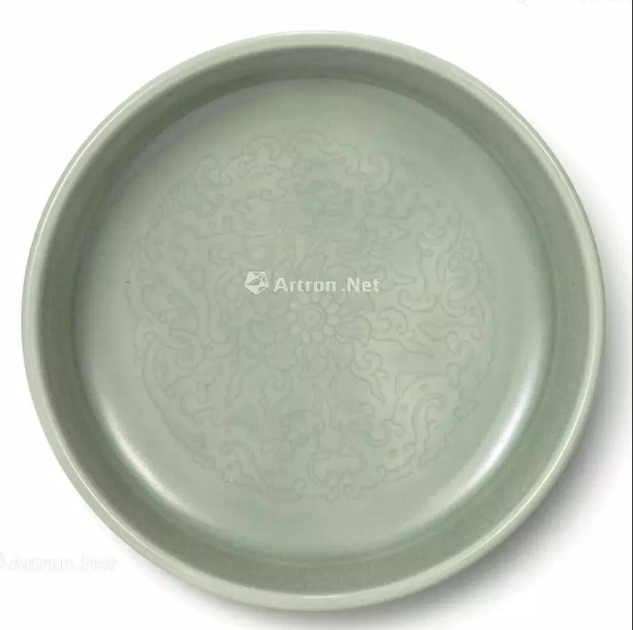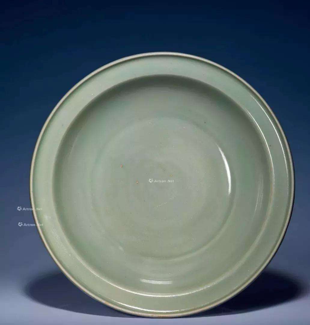 此類龍泉大盤,屬中國(guó)陶瓷史上器形最大的作品之一。明永樂(lè)年間,龍泉窯奉朝廷使命,燒制御用瓷器,與景德鎮(zhèn)官窯居于同等地位相互競(jìng)爭(zhēng)。此件器形釉光皆臻完美,顯示永樂(lè)年間龍泉窯出品之極高水準(zhǔn)。于浙江省處州龍泉官窯,有出土燒制失敗或糟朝廷退件之作,器形于此相同、大小接近或略小之品。
