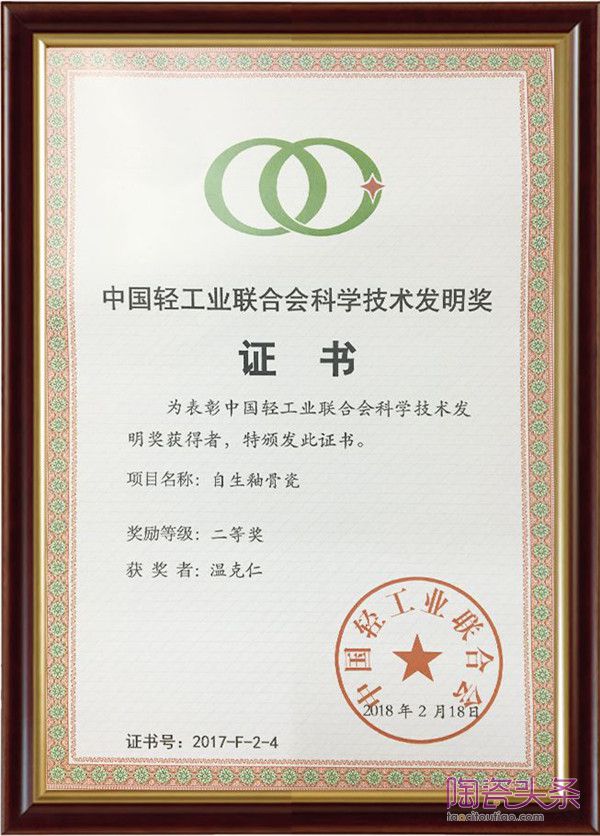 2017年,“自生釉骨瓷”技術在眾多高新技術產業(yè)中脫穎而出,榮獲“中國輕工業(yè)聯(lián)合會科學技術發(fā)明二等獎”,標志著自生釉骨瓷技術的技術創(chuàng)新以及在多領域的應用獲得高度認可。