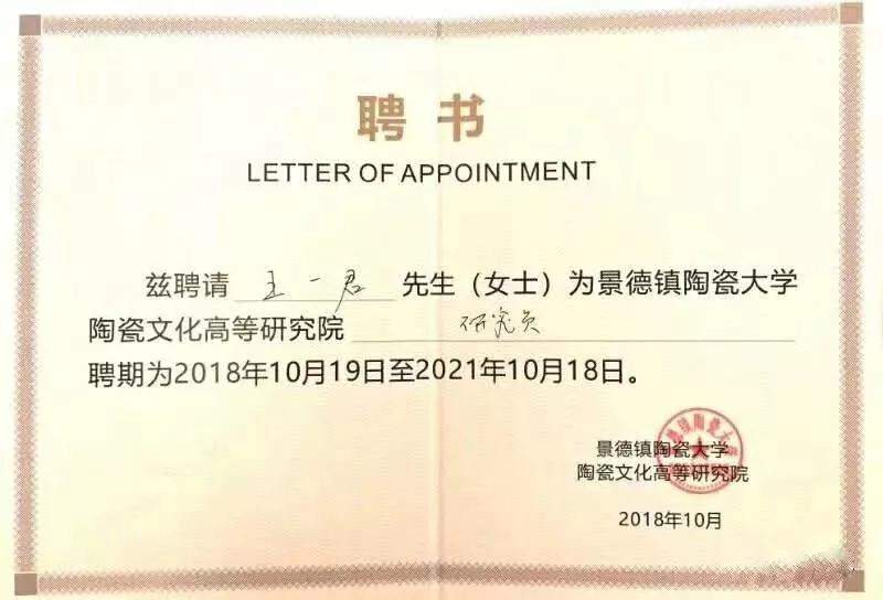 2018年10月19日,在景德鎮(zhèn)陶瓷大學名譽校長秦錫麟、景德鎮(zhèn)陶瓷大學黨委書記江偉輝親自見證下,景德鎮(zhèn)陶瓷大學校長、陶瓷文化高等研究院院長寧鋼聘任中國工藝美術大師、碩士研究生導師王一君為景德鎮(zhèn)陶瓷大學陶瓷文化高等研究院研究員。