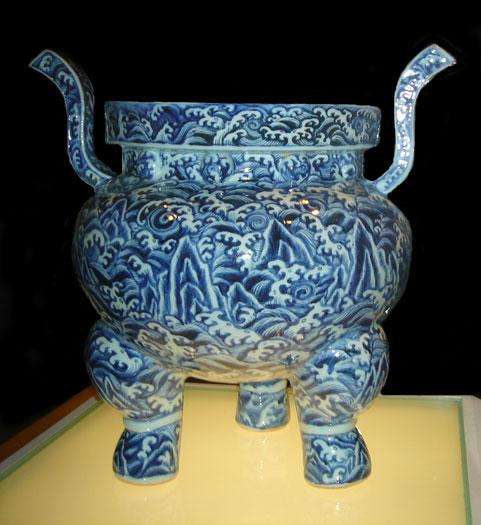 隋代起,又重現(xiàn)水波紋,欲尋覓先人情懷,崇尚古樸,作為古陶瓷器邊飾出現(xiàn)。隨著人類活動(dòng)范圍的日益擴(kuò)大與海外貿(mào)易的興起,宋人的眼光穿越到海外,宋人的胸懷盛裝了波濤洶涌的海水,其情愫表現(xiàn)在瓷器上,便有了宋代吉州窯瓷器上的白地褐彩海水紋,景德鎮(zhèn)影青瓷中的海水嬰戲紋,定窯瓷器上的海水游魚紋,耀州窯器上的落花海水紋。那模印、刻劃、彩繪的海水,波濤洶涌、驚濤拍浪,給人以強(qiáng)烈的藝術(shù)震撼。以至于今人模仿造假時(shí),所刻繪的海水紋均無法再現(xiàn)宋人海水紋的那種神韻,顯得死板呆滯,成為絕響。元、明、清瓷器上的海水紋屢見不鮮,白龍、綠龍、青花龍?jiān)诤鸬耐幸r下,氣勢(shì)奪人,表現(xiàn)了盛世的張狂、帝王的威嚴(yán)、征服者的得意。