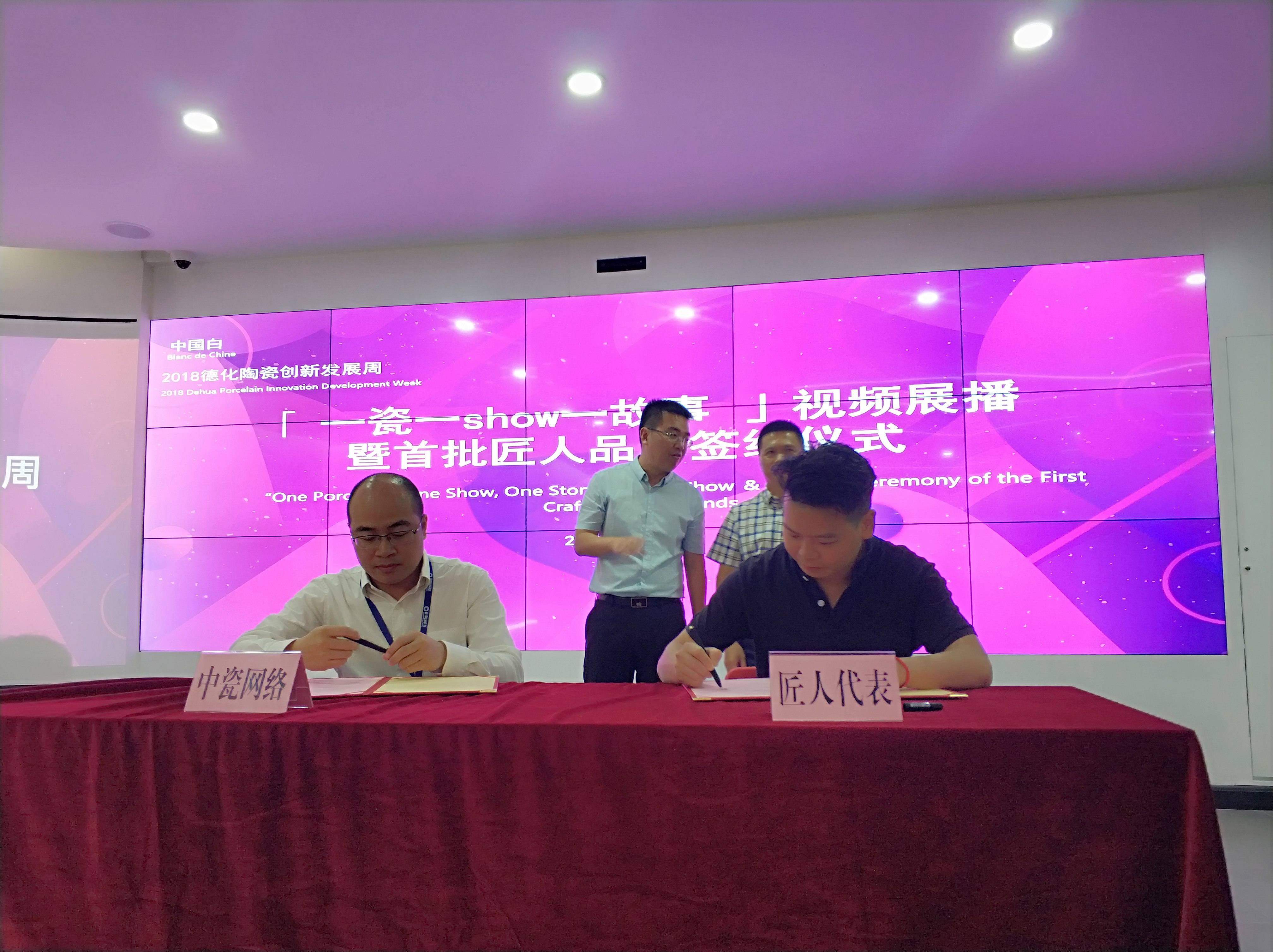 主題視頻展播結(jié)束后,中瓷網(wǎng)絡(luò)副總丘欣明與匠人代表李璋高上臺(tái),共同簽署了“匠人經(jīng)紀(jì)運(yùn)營(yíng)計(jì)劃”合作協(xié)議,德化陶瓷首批20位匠人經(jīng)紀(jì)運(yùn)營(yíng)計(jì)劃正式啟動(dòng)。