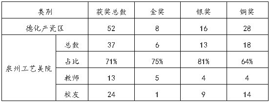 泉州工藝美術(shù)職業(yè)學(xué)院教師、校友成為德化產(chǎn)瓷區(qū)獲獎的主力軍,占據(jù)71%的獲獎份額。教師邱玫瑰《游園﹒今夢》、張南章《唐太宗》、莊虹虹《希望的田野》、黃永星《何朝宗》(NO.3雕塑)、鄭振雷《衣襟飄香》(8頭文具)等5件作品獲得金獎,邱玫瑰《園林清曲》、張麗芬《女人與貓系列》(3件)、鄭振雷《當(dāng)局者》、高越《畔山云海》等4件作品獲得銀獎,周金田《逐夢》、許慶裕《海納百川》、梁雙升《自然神曲》、陳名昭《阿爾法城考古報告》等4件作品獲得銅獎。在德化報名參評的泉州工藝美術(shù)職業(yè)學(xué)院畢業(yè)生,獲得1金、9銀、14銅。此外,泉州工藝美術(shù)職業(yè)學(xué)院舉辦的國家藝術(shù)基金“白瓷瓷塑藝術(shù)創(chuàng)新人才培養(yǎng)”研修班學(xué)員,在德化學(xué)習(xí)期間創(chuàng)作的作品,也獲得1金、1銀、4銅的好成績。