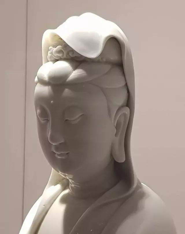 觀音像高51.5厘米,在明代德化瓷塑中屬燒制難度較高的作品。觀音像頭發(fā)盤髻,戴風(fēng)帽披肩長巾;面龐豐腴略呈橢圓形,丹鳳眼微合,懸膽鼻,櫻桃小口,胸前橫貫一串蓮花珠飾;著寬袖長衣,胸部正中衣帶交結(jié),圓肩修身;右部衣紋簡明豐滿,左側(cè)折疊密集流暢,衣裳下擺向右邊角翻卷,迎風(fēng)飄拂;露一足踏立于凈瓶之上,蓮花隨波濤浮動,另一足水花掩蓋,足下駭浪洶涌,翻滾不止,幾股水流交織纏繞在一起,激起晶瑩剔透的水珠,在浪尖上跳躍。
